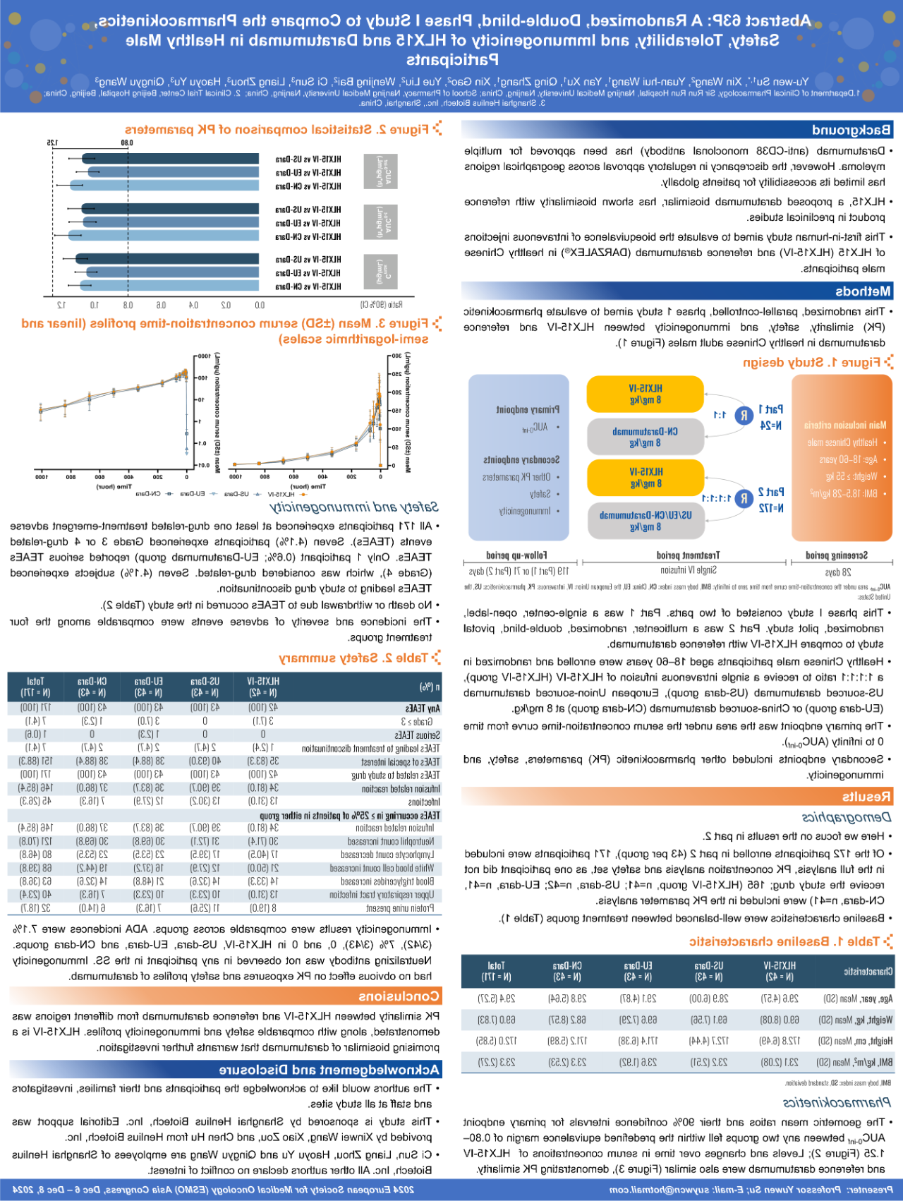 Of the 172 participants enrolled in part II (43 per group), 165 (group A, n=41; group B, n=41; group C, n=42; group D, n=41) were included in the PK analysis. The geometric mean ratio and its 90% confidence intervals for primary endpoint AUC0-inf between any two groups were within the predefined equivalence margin of 80.00–125.00%, indicating PK similarity between HLX15 and the reference daratumumab. Other PK parameters were also comparable. Treatment-emergent adverse events (AEs), treatment-related AEs and AEs of special interest were mostly mild (grade 1 to 2) and similar across all groups. The overall positive rate of anti-drug antibody was also comparable across the groups with no neutralizing antibody being detected.