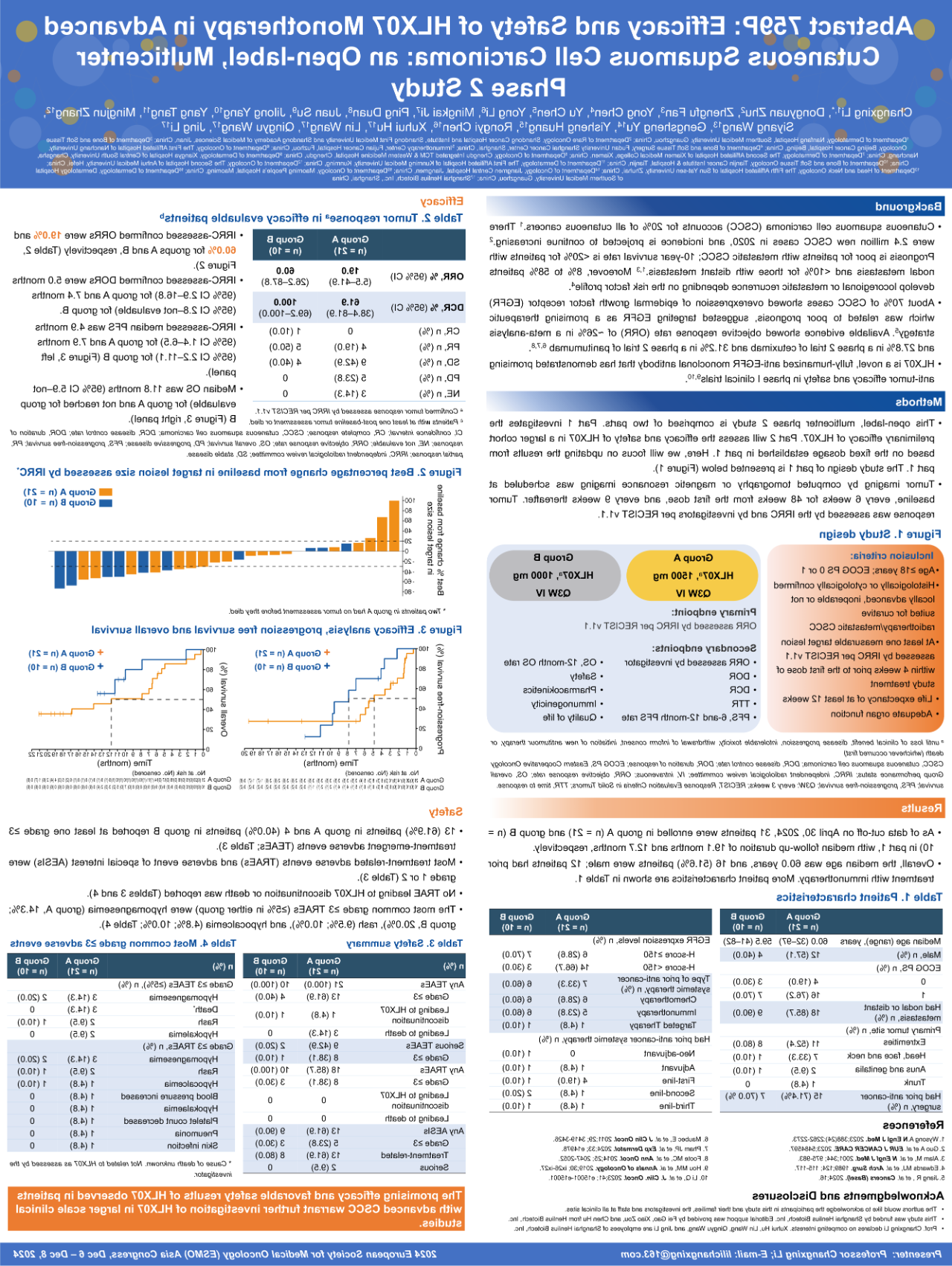 Among them, the study results of Phase 2 Clinical Trial in nccRCC was selected as Mini Oral. And the study results of HLX07-NPC201 were accepted as a Late-breaking Abstract and were presented by Professor Li Zhang. Moreover, the results of HLX07-CSCC201 were first presented at ESMO Asia 2023, where its poster won the best poster award, and were presented with updated results at ESMO Asia 2024.