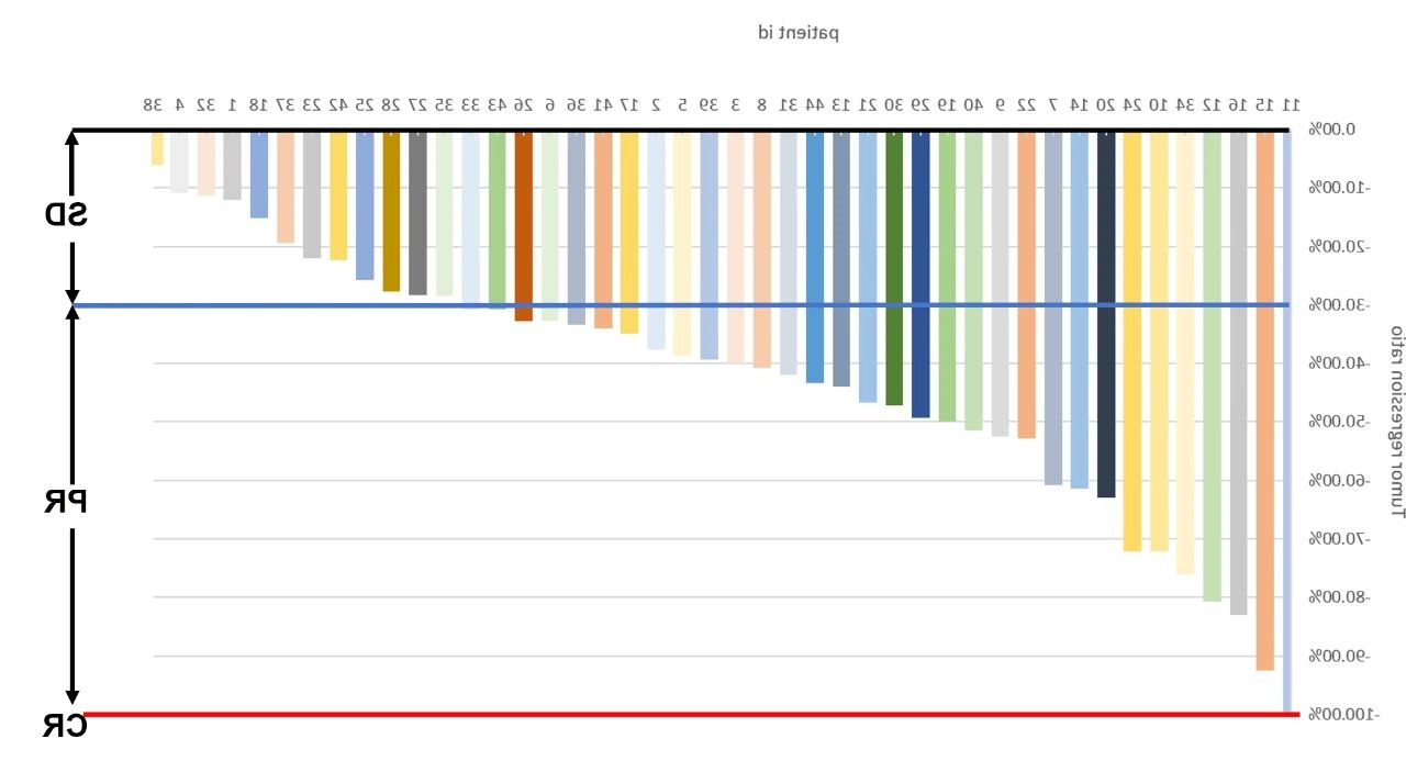 Tumor regression ratio: Waterfall plot of the best percent change in target lesion diameter from baseline, colored according to best of response (n=44). All patients experienced tumor regression in the target lesion, 33 patients achieved PR/CR.
